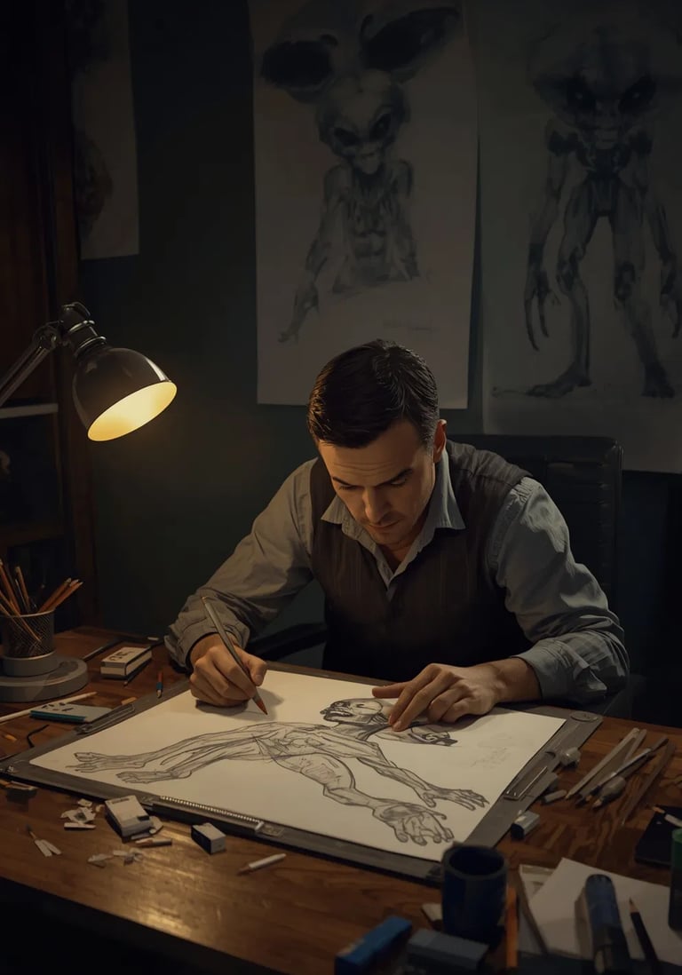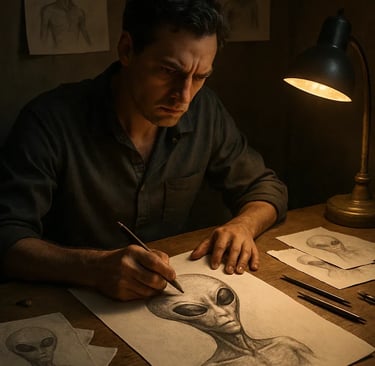 Porque la verdad es que no sabemos nada: ni de sus formas, ni de sus hábitos, ni de su posible existencia. Lo único que tenemos son teorías, hipótesis y silencios del cosmos. Sin embargo, el colectivo humano ha preferido inventar imágenes que lo colocan por debajo de nosotros, seres pálidos, desprovistos de alegría, sin ornamento ni vitalidad. ¿Por qué? Para sostener la pretensión de que la especie humana sigue siendo la dominante —no solo en la Tierra, sino también en los confines conocidos y desconocidos del universo.