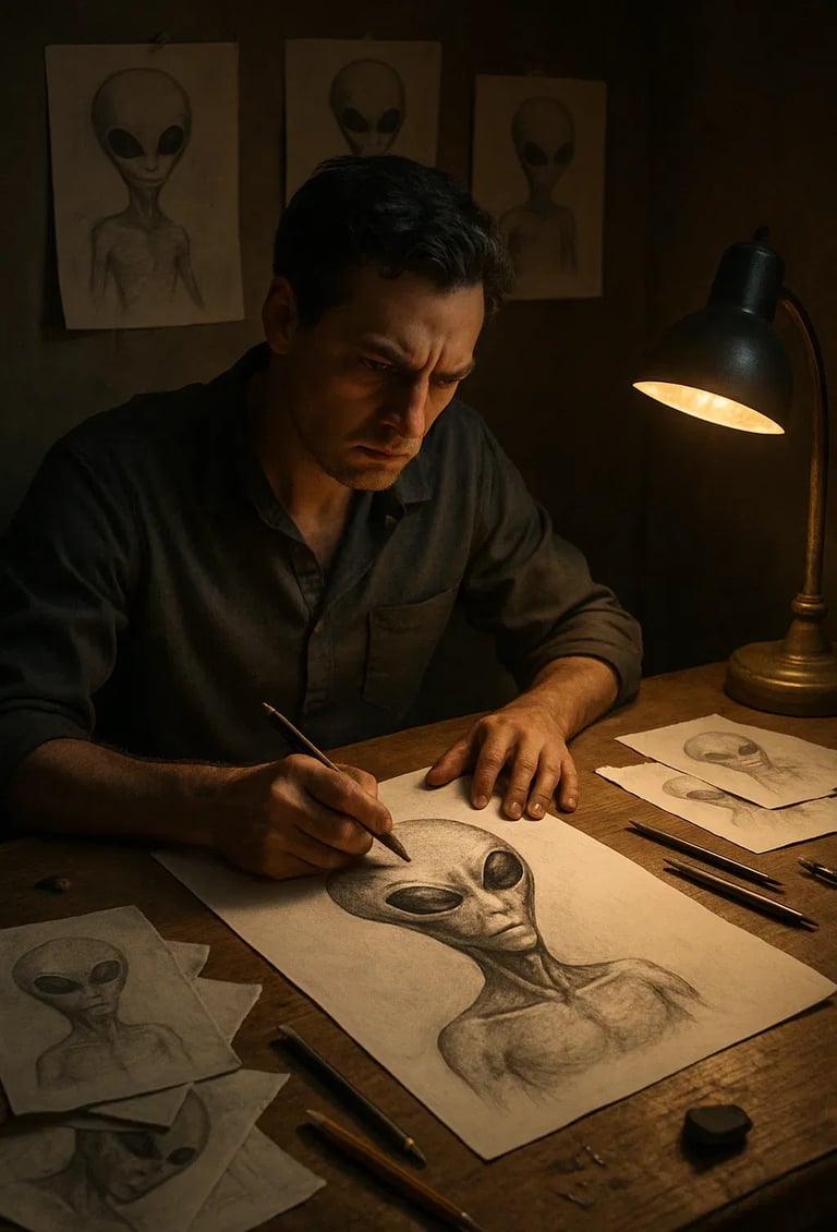 Durante décadas, el ser humano ha dibujado, pintado y filmado al “extraterrestre” como un humanoide gris, de gran cabeza, ojos negros y almendrados, cuerpos delgados, piel desnuda, sin expresión, sin sonrisa. Una caricatura. Una proyección más de nuestra soberbia.