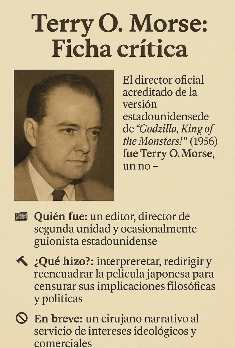 Terry O. Morse no fue un director creativo en esta obra, sino un cirujano ideológico. Su trabajo fue diluir el dolor ajeno, borrar rastros de culpabilidad, y venderle al mundo un monstruo sin conciencia. La versión estadounidense de Godzilla no fue simplemente “adaptada”, sino desactivada emocional y políticamente, para que el espectador pudiera disfrutar la catástrofe sin remordimiento.